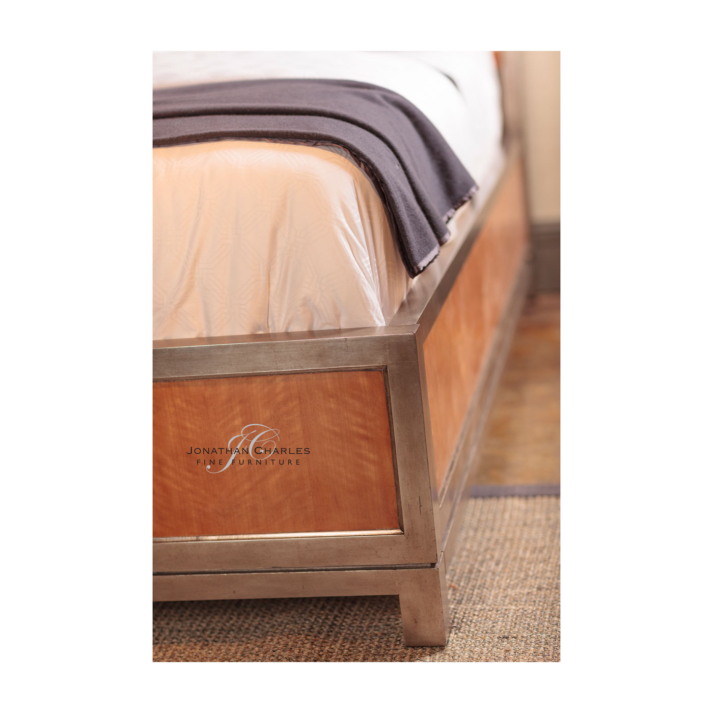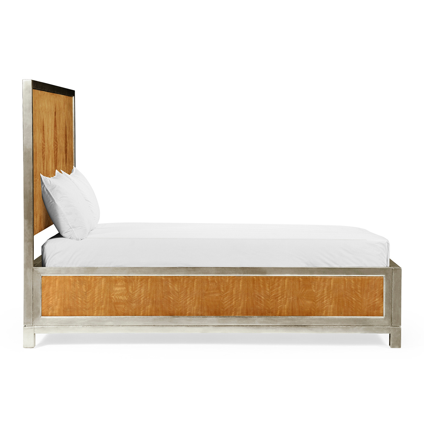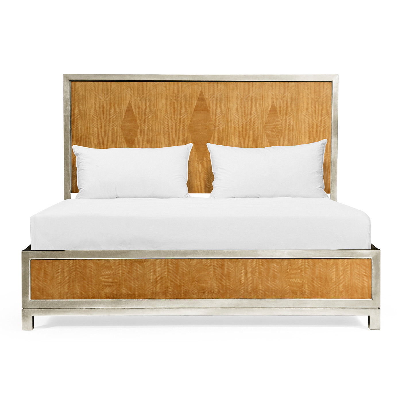 Elegant satinwood parquetry bed designed by Alexander Julian inspired by "Herringbone blazersuit" and signature argyle diamonds the rectangular wooden panels enclosed by a silvered aluminium frame.
