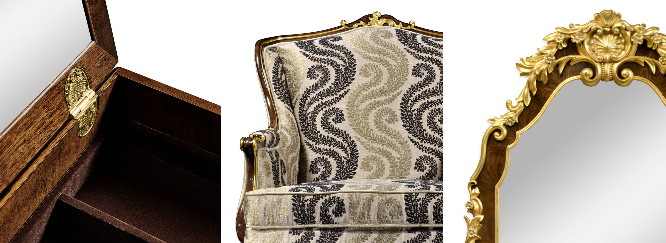 Antique brown mahogany four-drawer standing jewelry cabinet set on cabriole legs with gilt carving and brass detailing inlay to the top...
