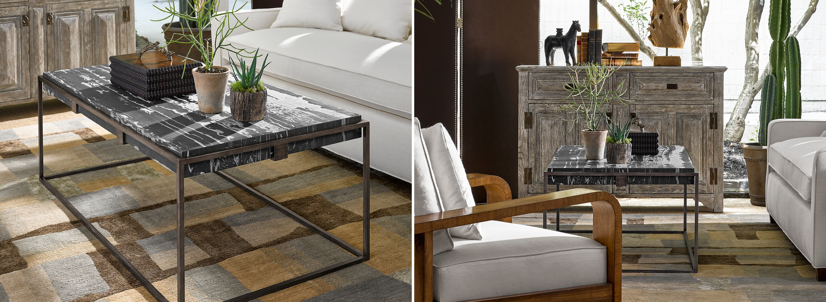 Outdoor circular table with marble top, set on above an antique black brass with highlight geometric base. (Old salescode: 495604-LBA)..