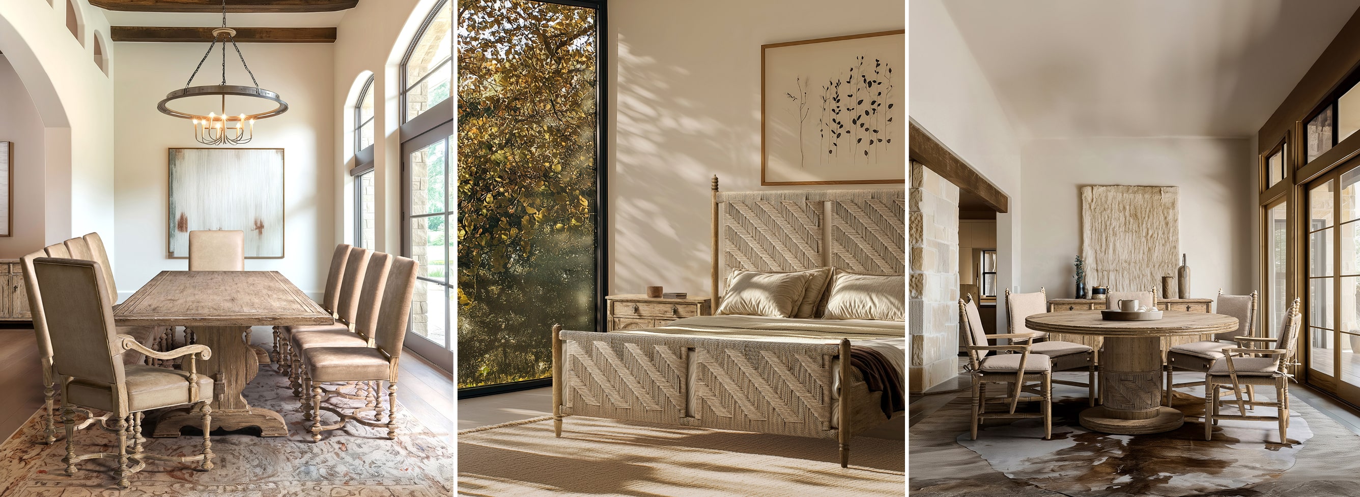 Blending timeless form with handcrafted texture, the Sagehill Woven Bed brings depth and detail to the bedroom. Intricately handwoven rope panels form bold chevron patterns across the headboard and footboard, framed by turned oak posts that rise with sculptural elegance. A Timberon Grey Oak finish e..