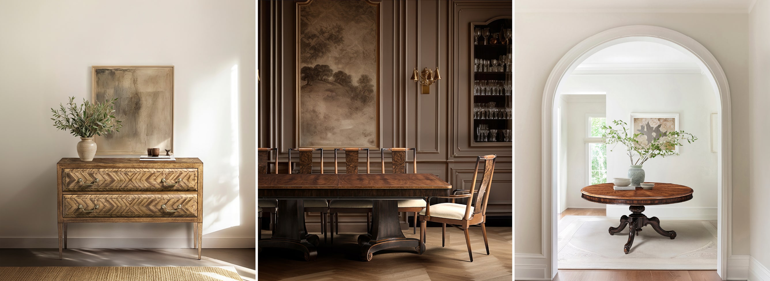 Experience the elegance of tradition with the beautifully crafted Rosette dining table, designed to be the focal point of your dining space. The table showcases exquisite crotch walnut and Cerajeria veneers, creating a rich and luxurious surface that exudes timeless charm. Its dark walnut pedestal b..