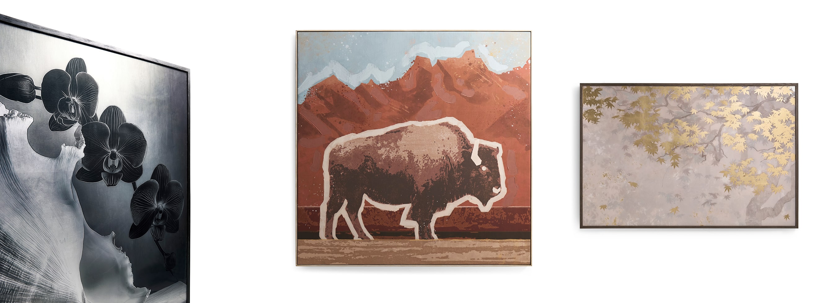 A pair of black-and-white orchid photographs presented on a hand-applied gold leaf background. A modern yet timeless composition with elegant, transitional appeal...