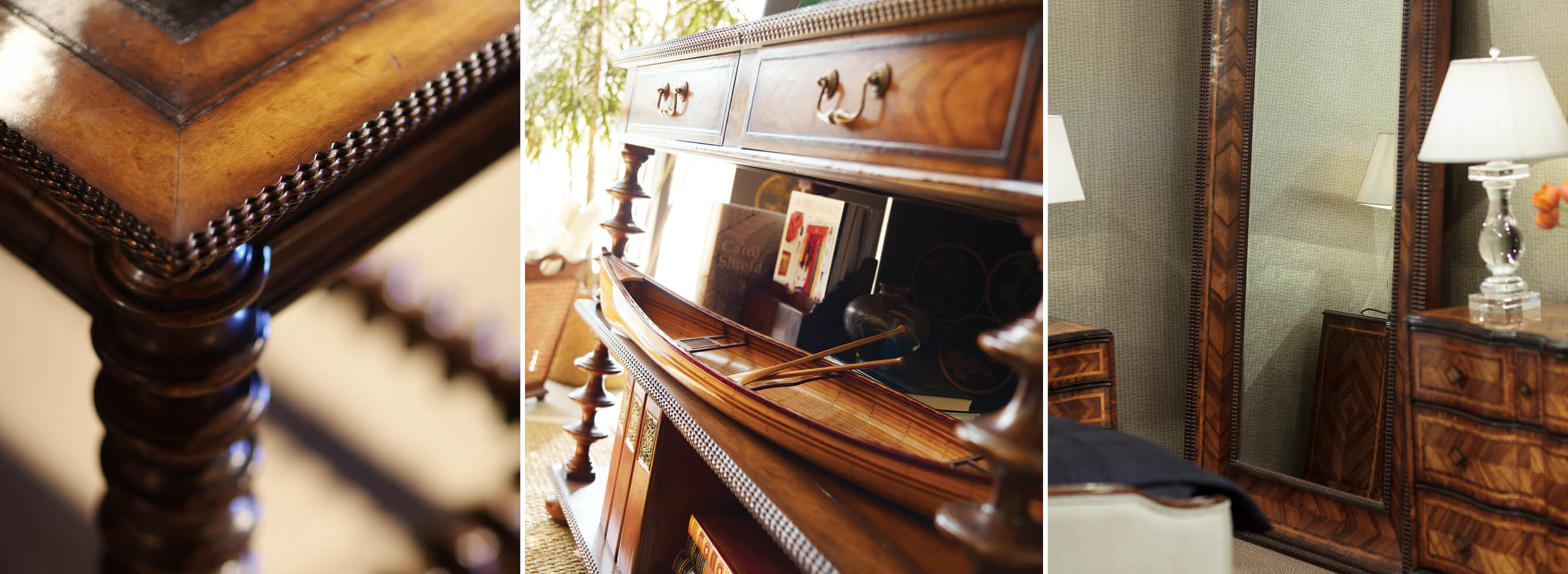 Writing table in walnut with heavily distressed finish, leather inset top with gadrooned moulding and flush drawers to the apron. Inspired by Dutch furniture of the 17th century. (Old salescode: 494212)..