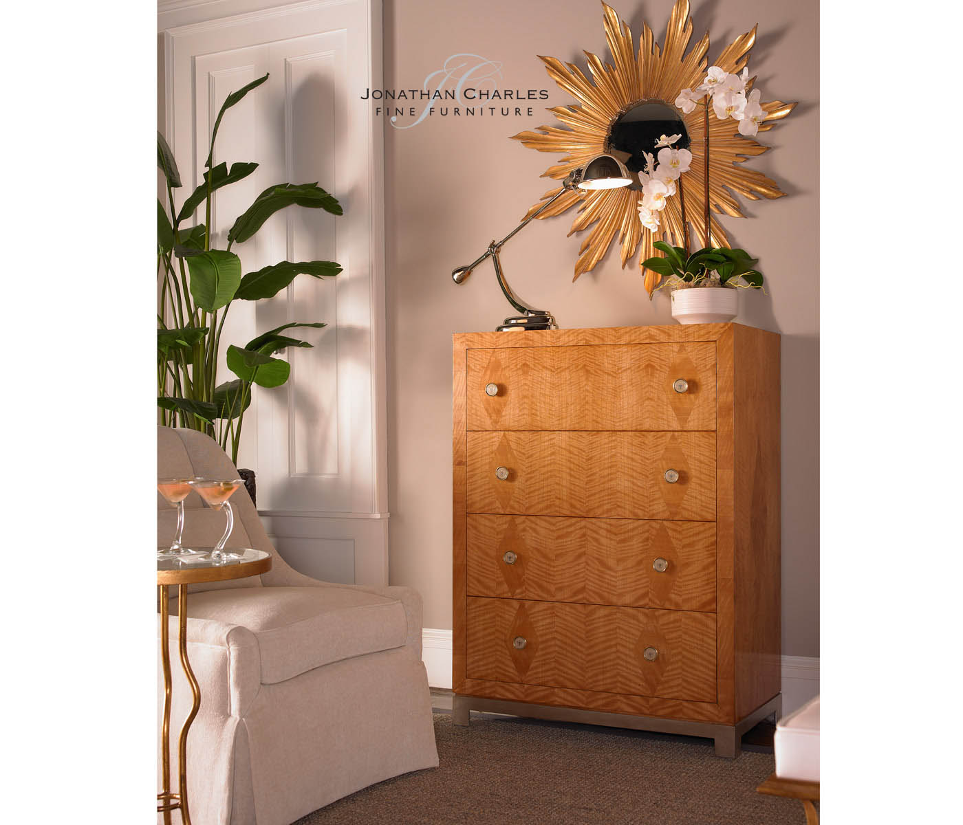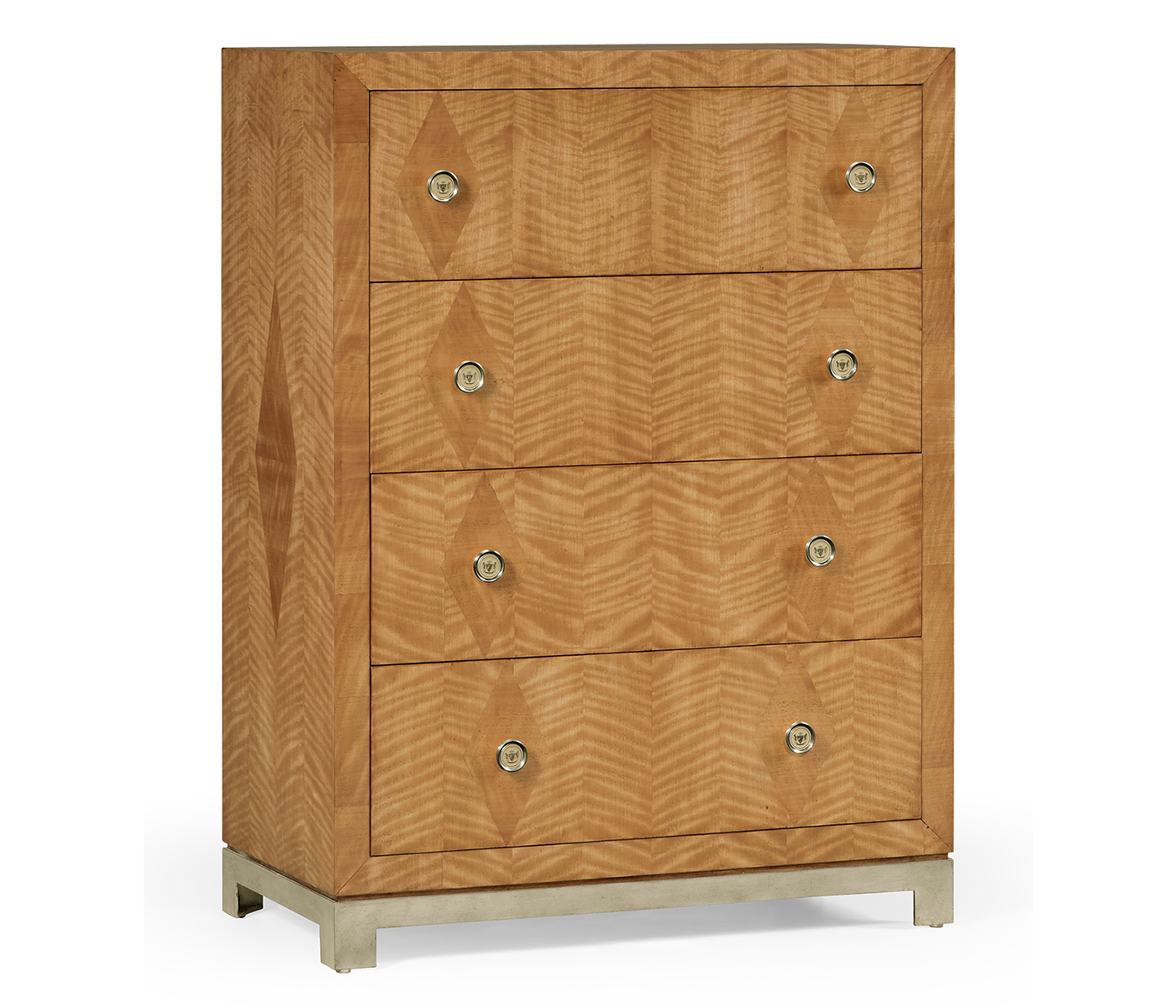 Chic satinwood parquetry chest of four drawers designed by Alexander Julian inspired by his classic "Herringbone Blazer Suit" and signature "Argyle Diamond Sweater" the rectangular wooden panels raised on a silvered metal base. Unique custom made Italian enamel pulls resembling buttons on a double-breasted blazer.