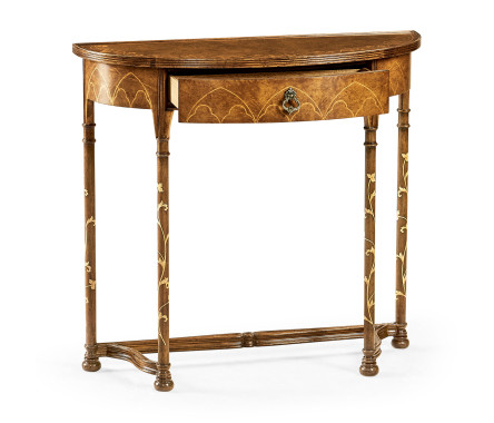 Walnut mirror frame with hand carved leather panels inset around the frame, plain beveled mirror and elaborate cast brass details in the corners.
