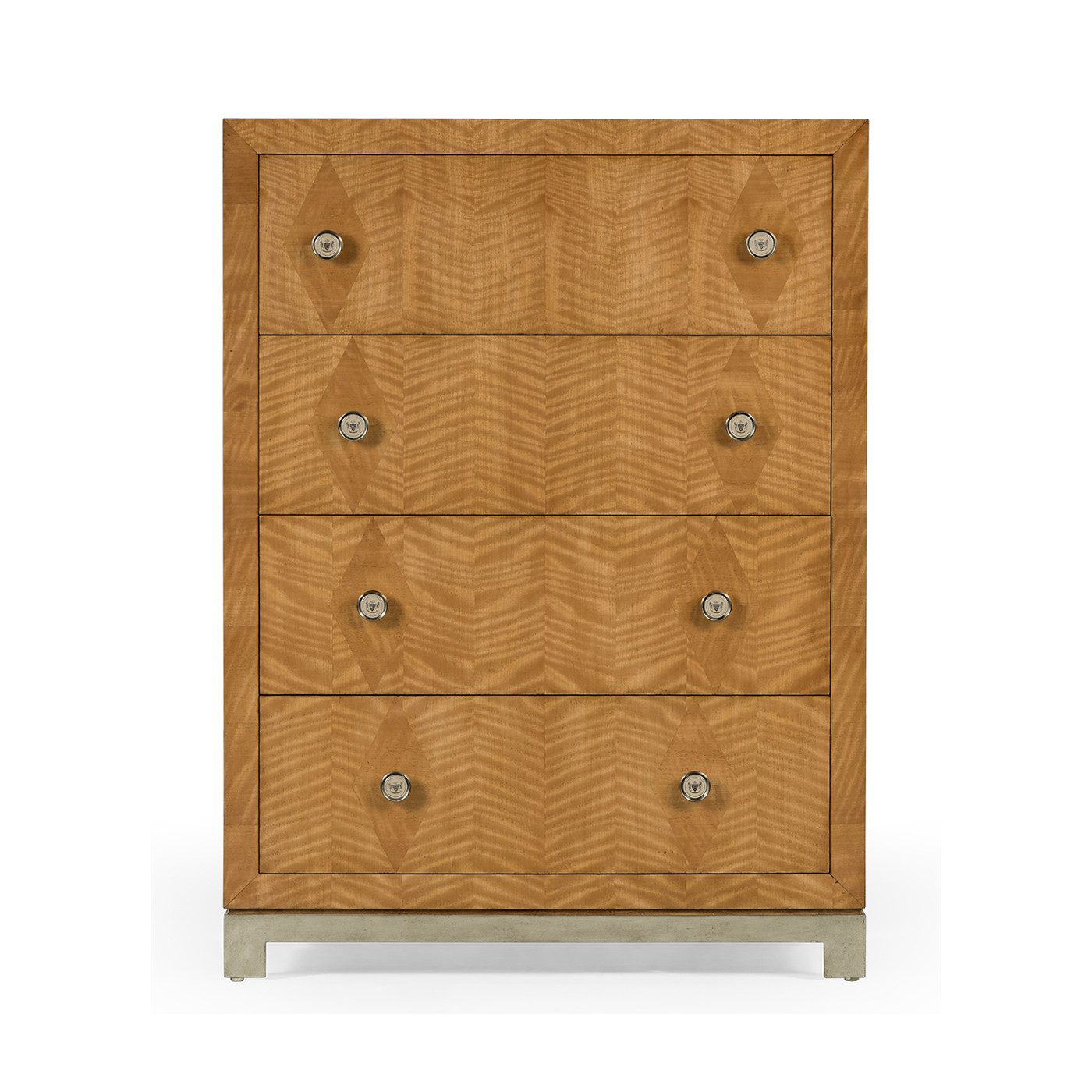 Chic satinwood parquetry chest of four drawers designed by Alexander Julian inspired by his classic "Herringbone Blazer Suit" and signature "Argyle Diamond Sweater" the rectangular wooden panels raised on a silvered metal base. Unique custom made Italian enamel pulls resembling buttons on a double-breasted blazer.