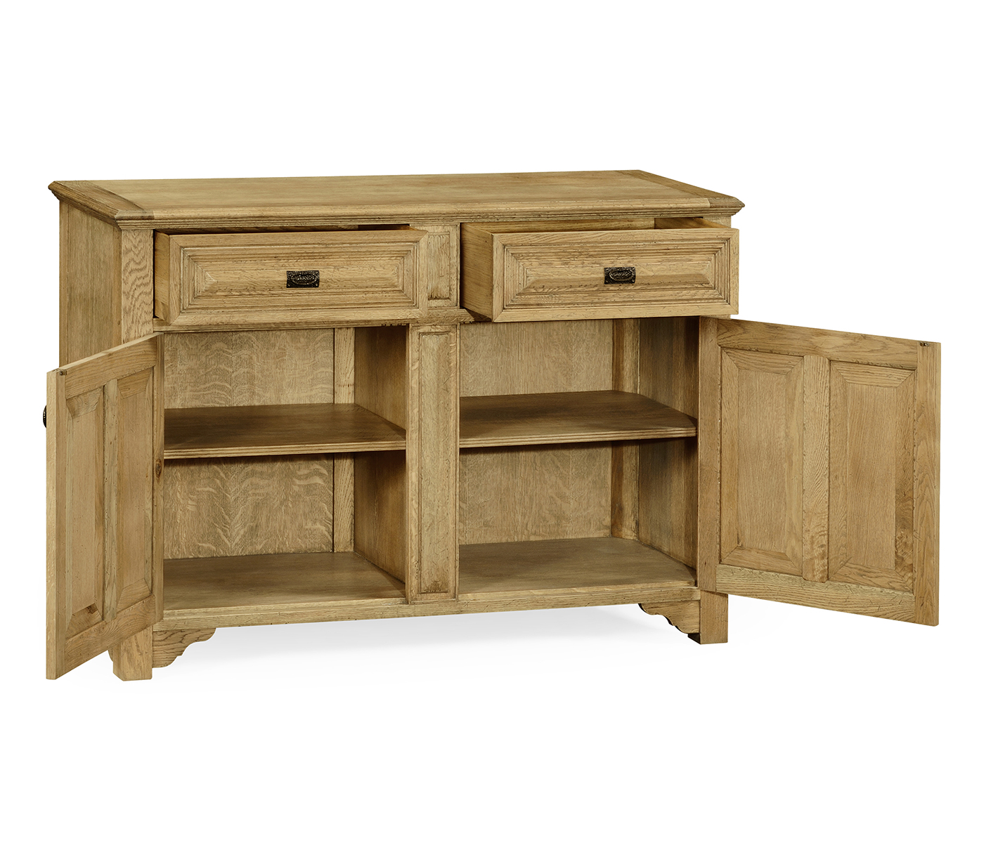 Natural oak substantial side cabinet with stepped pyramidial panelled mouldings to the two drawer fronts and doors, and stylised iron drawer handles and strap hinges. The design based on a piece of c.1600. (Old salescode: 493560-L)
