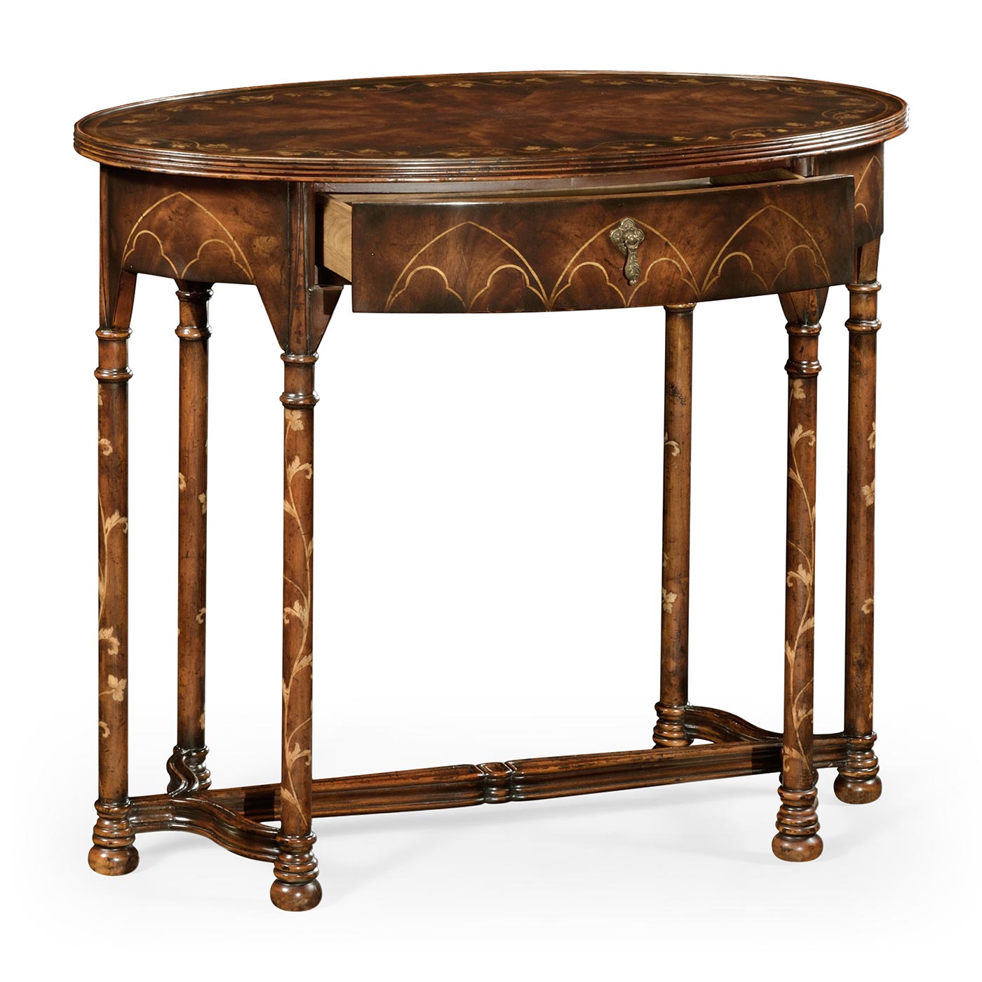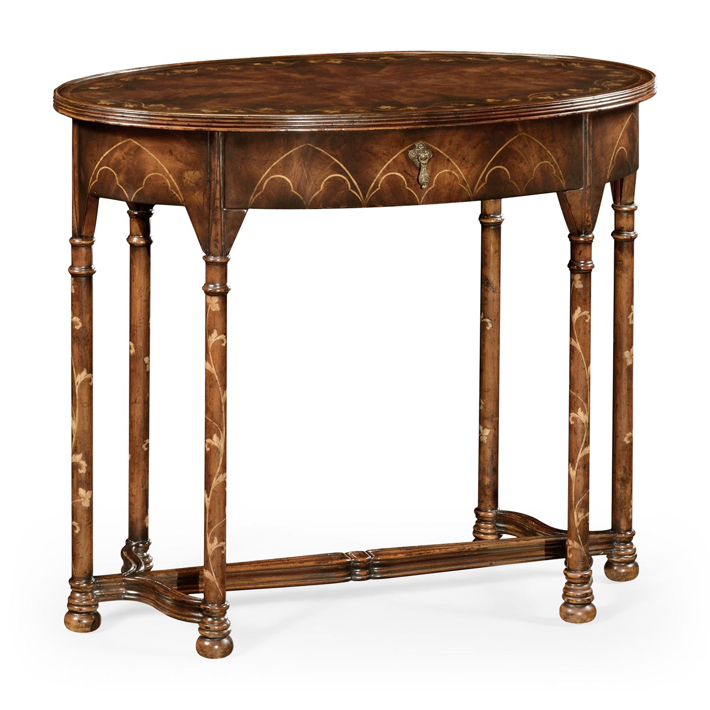 Mahogany veneered oval side table in the "Gothic" style of the late 18th century having fine contrasting inlays to the top and frieze, and legs painted with the same running floral motifs and arches.