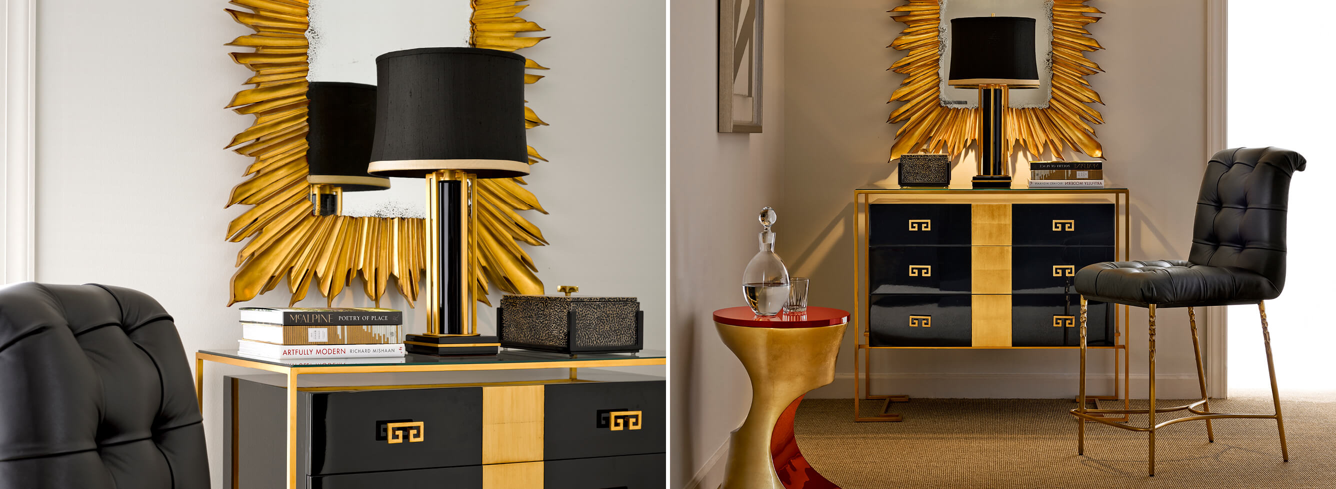 Tray table in Smoky black set above on gilded iron in gold-leaf...