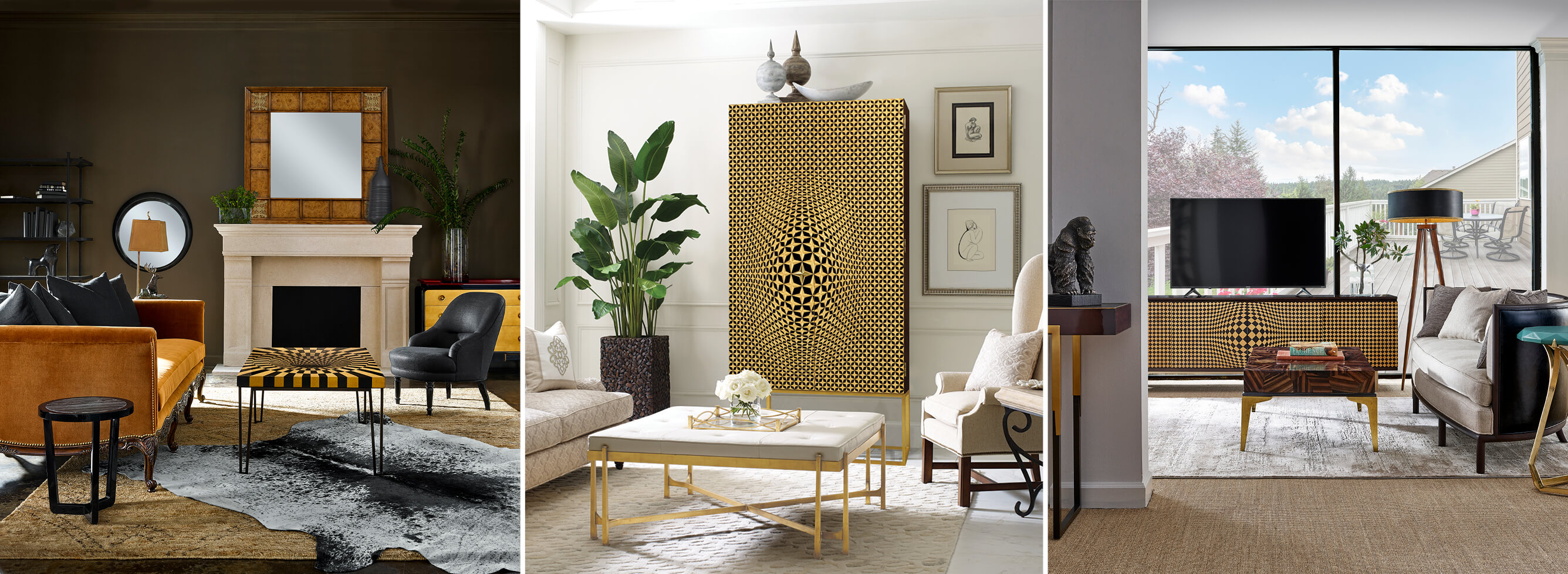 TV entertainment unit with a brass base and 3D op art design made using different wood veneers, including bright satinwood, and referencing rompe l’oeil effects. This provides a fresh look at the Old World technique of marquetry...