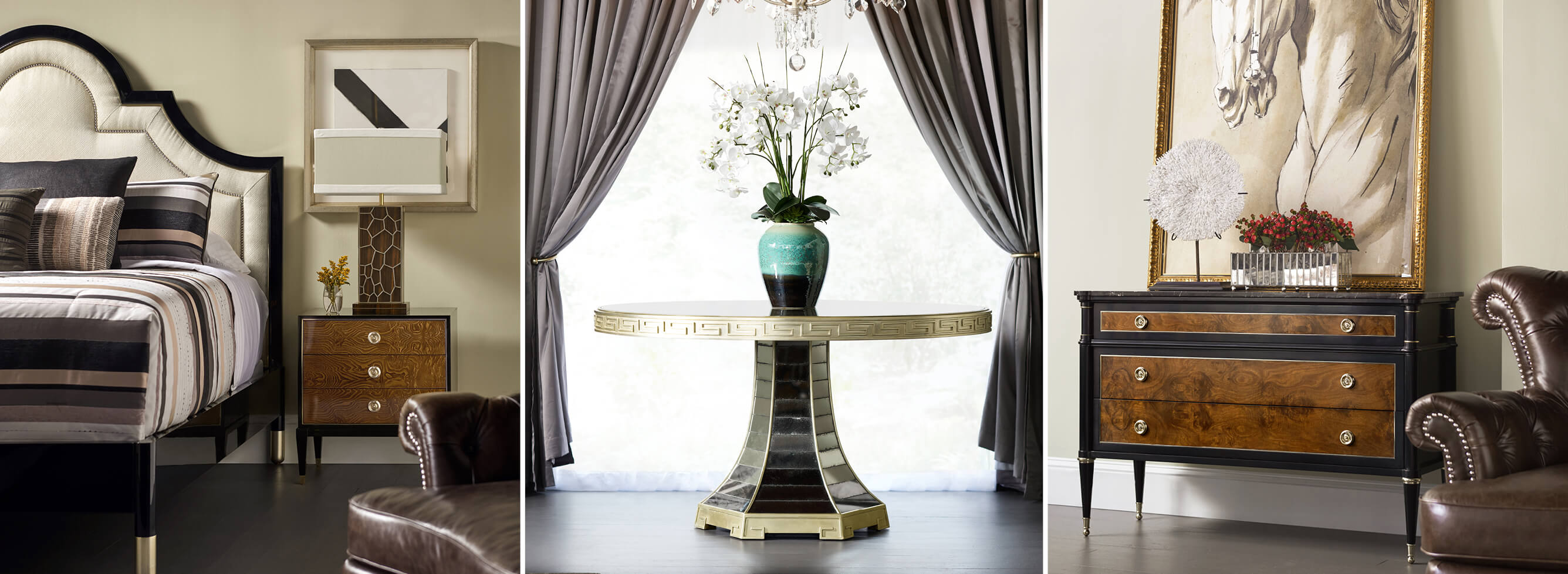 Madison piano black and amber ash burl chest of drawers with grey wave marble top...