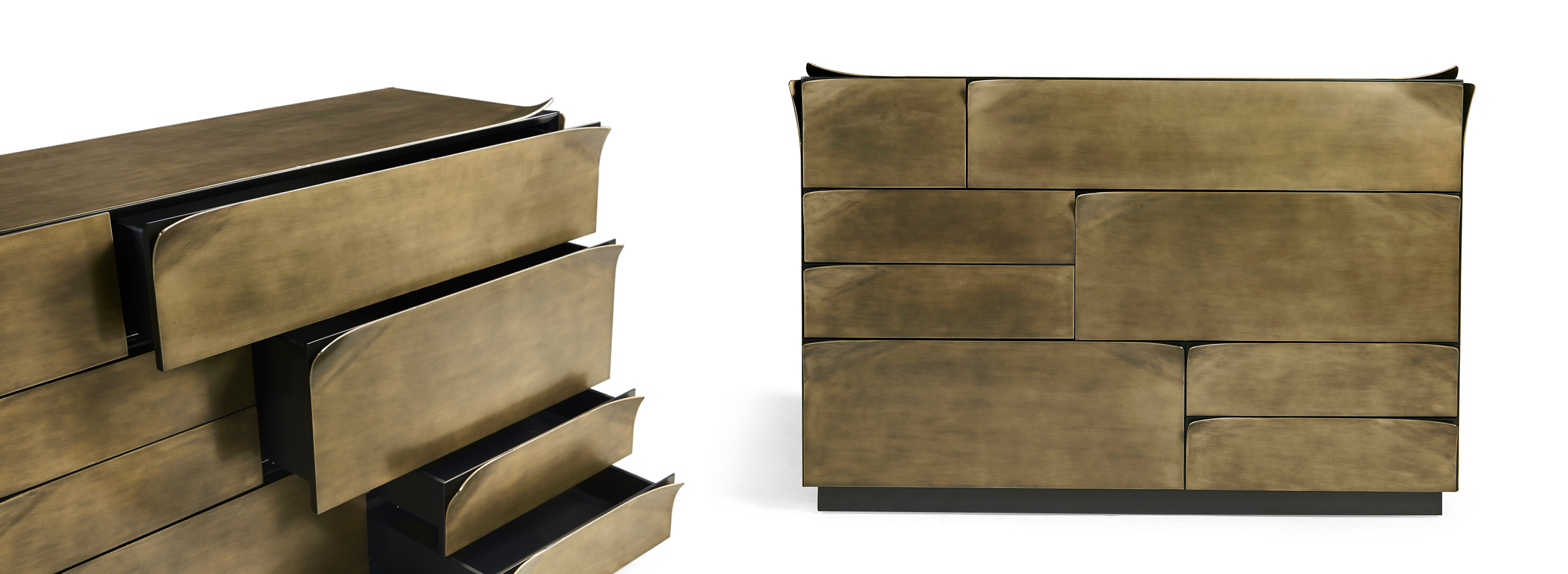 The Hammersmith Drawer Chest is a striking blend of bold design and sleek elegance. Its structure, encased in brass sheets bent at the edges, creates a unique sense of dimension and depth. This sophisticated detail enhances the chest’s modern appeal, making it a luxurious focal point in any space. F..