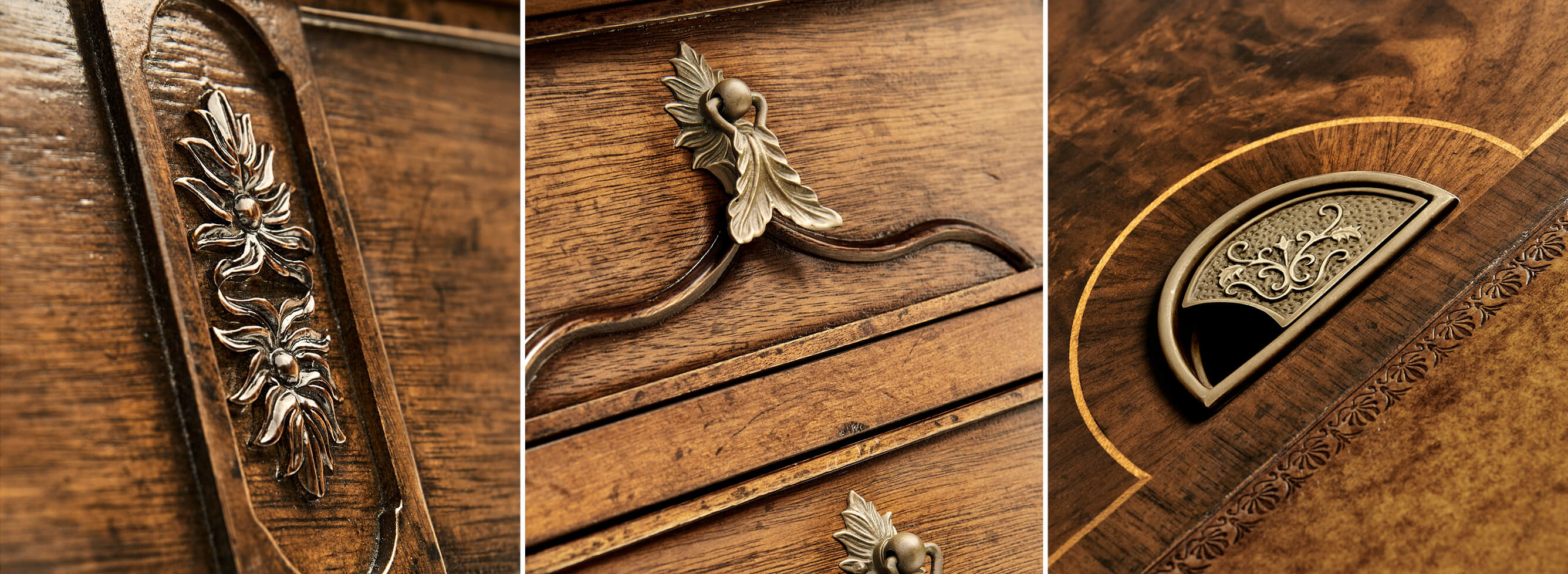 Dark American crotch walnut side table with drawer fronts hand carving. (Old salescode: 493496)..