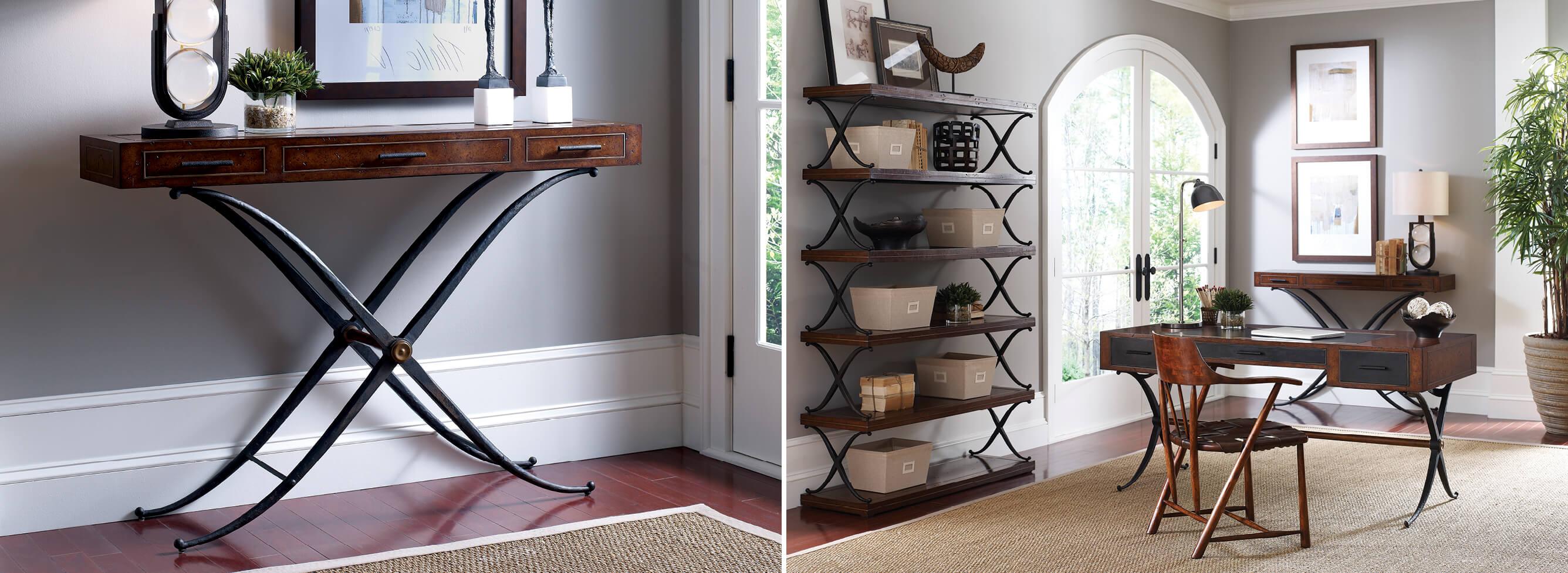 Wrought iron console table with black finished base and burl walnut veneer top. (Old salescode: 494135)..