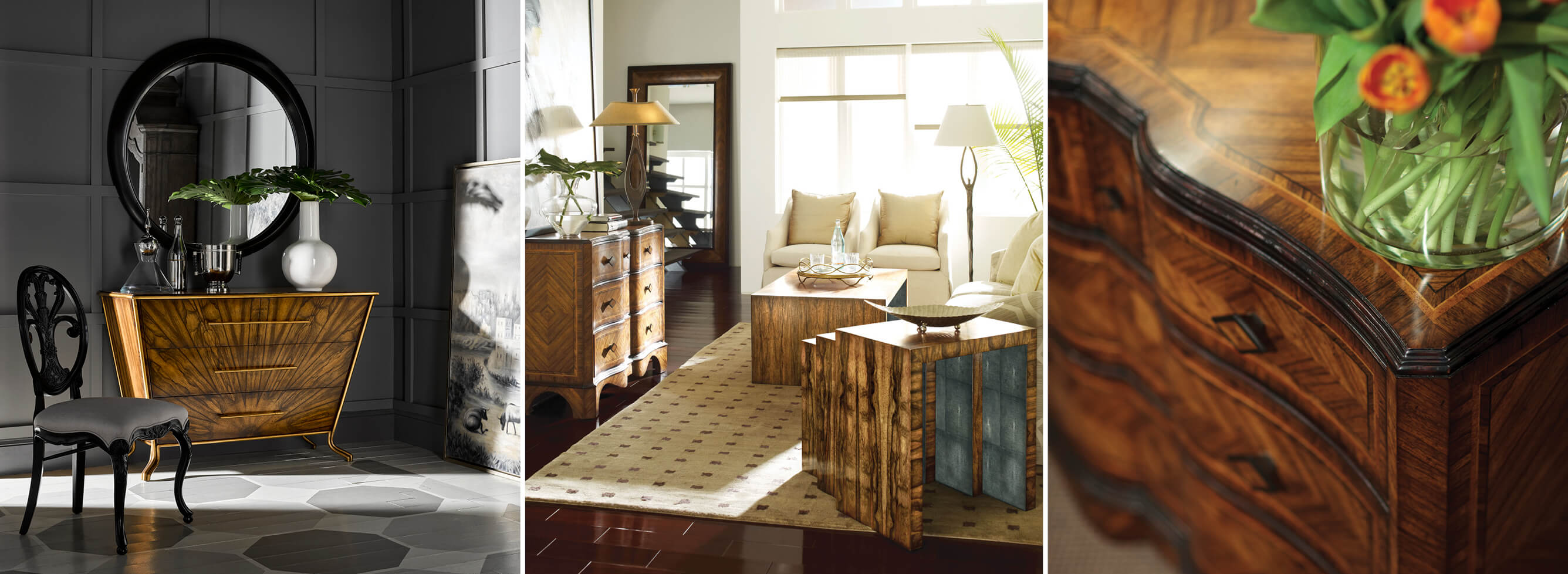 Decorative chest of drawers in traditional style, the stunning Argentinian walnut wood veneers bringing a contemporary twist. Unusual diamond shaped handles to the four drawers. Contrasting black painted finish...
