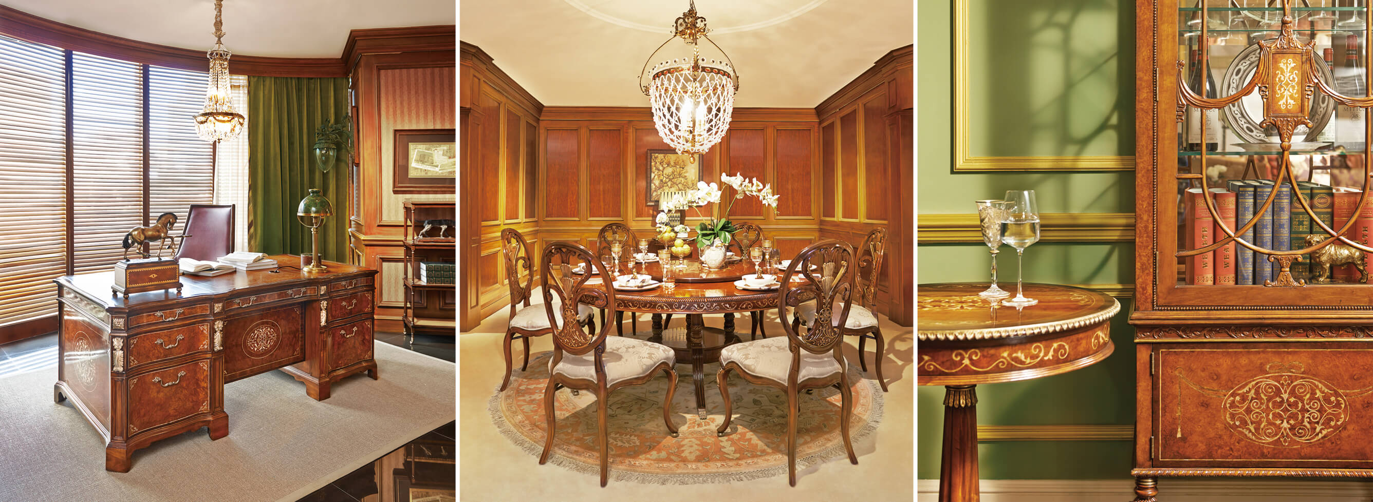 Spectacular Regency style rectangular dining table with burl oak veneer and carved walnut openwork bases. Fine mother of pearl inlays to the apron and table top. A gadrooned edge with deep carving...