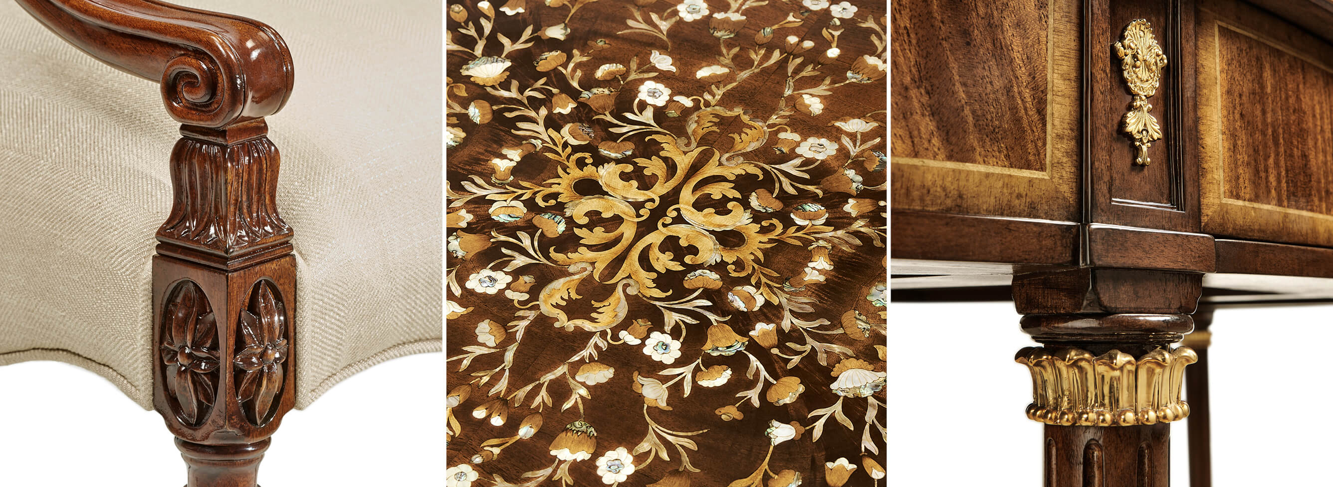 This lamp table features mother of pearl and marquetry inlays. Finished in medium antique mahogany, the level of detail in this piece adds a regal element to any space...