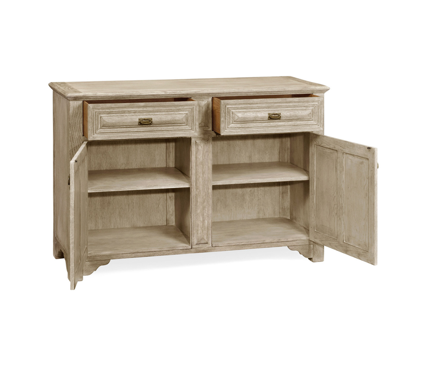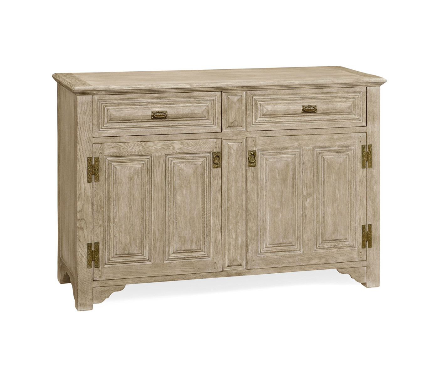 Greyed oak substantial side cabinet with stepped pyramidial panelled mouldings to the two drawer fronts and doors, and stylised iron drawer handles and strap hinges. The design based on a transitional piece of c.1600. (Old salescode: 493560-GO)