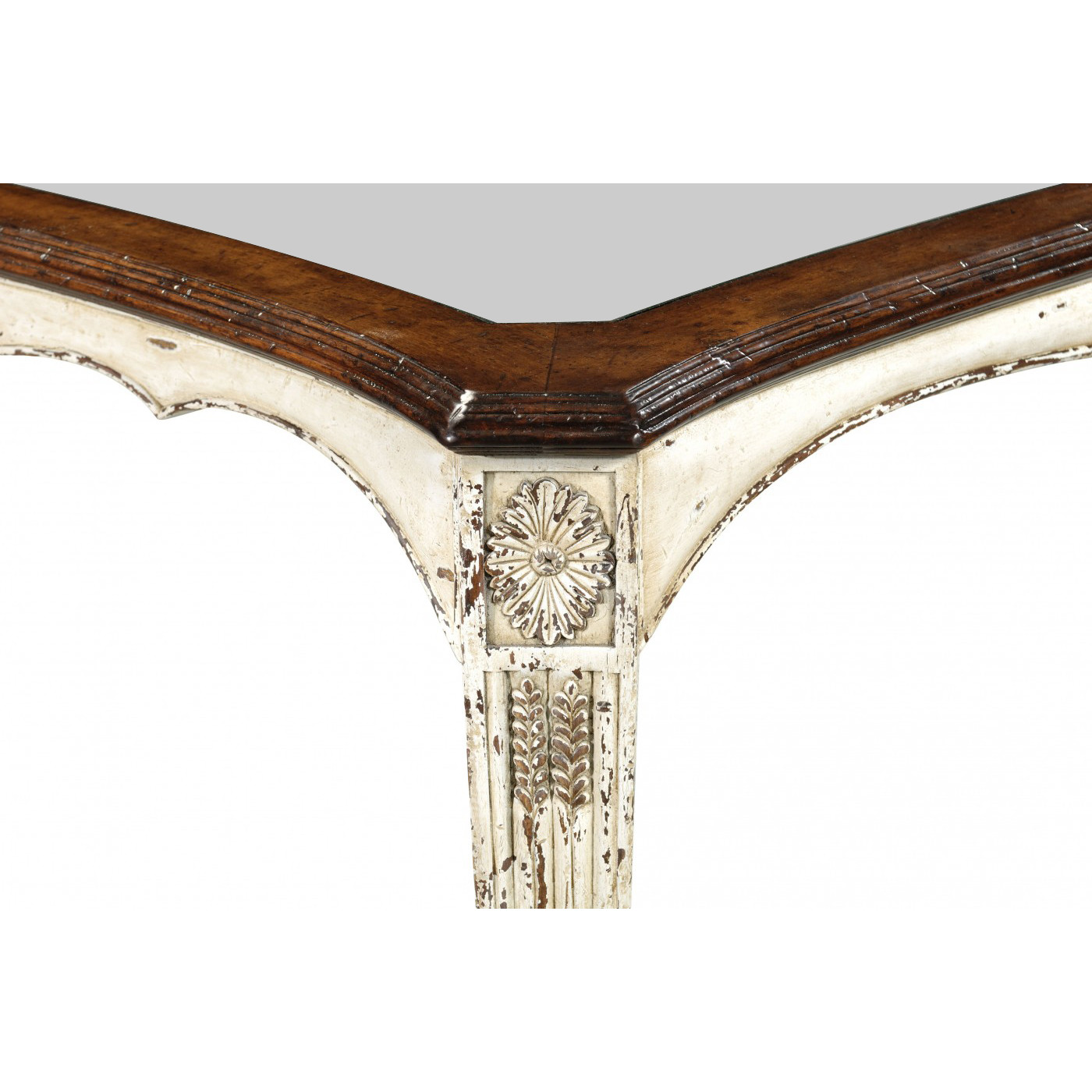 French provincial style antiqued white painted dining table with glass top and distressed planked hand carved legs and aprons with fern detailing set on fluted tapering legs with spade feet. Seats: 8.
