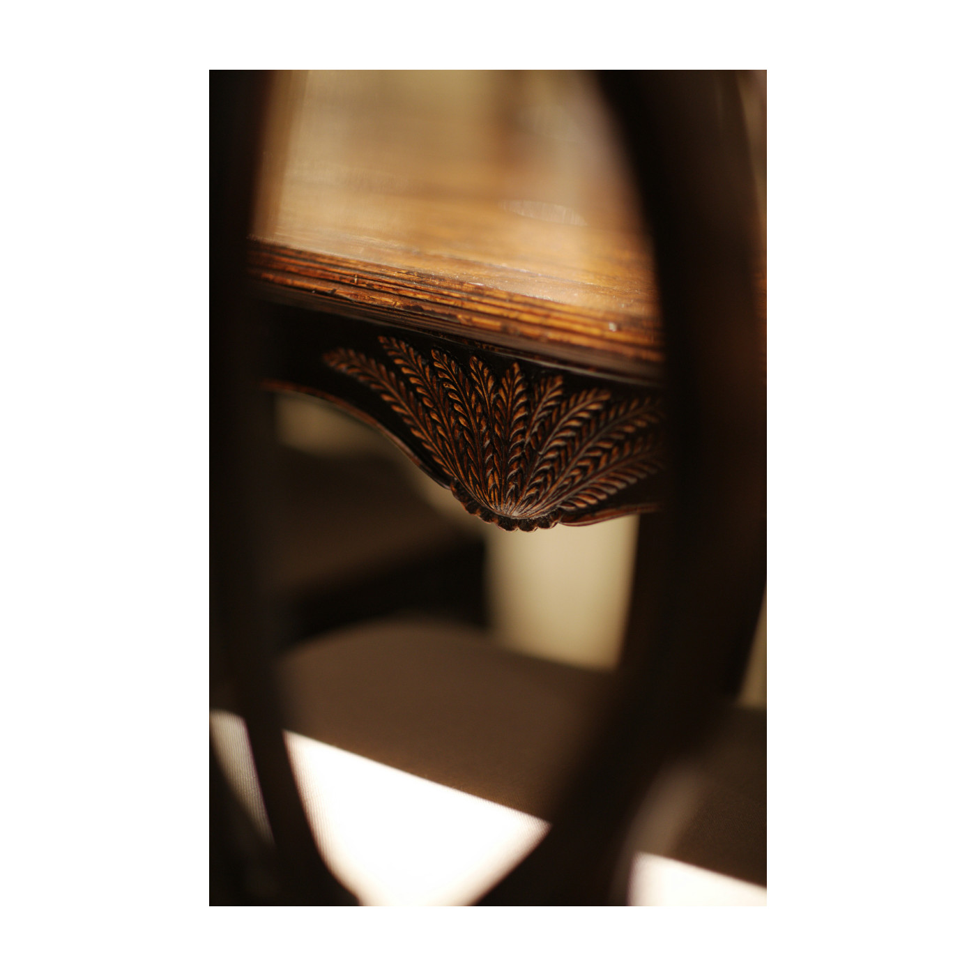 French provincial style antiqued black painted dining table with distressed planked walnut top hand carved legs and aprons with fern detailing set on fluted tapering legs with spade feet. Seats: 8.