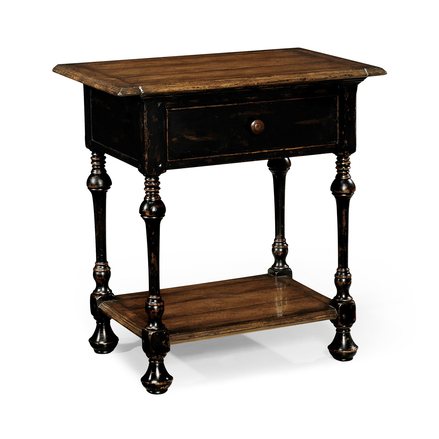Planked walnut and black rub-through finish rectangular side table with tapering baluster legs and under-tier inspired by Northern Italian country furniture.