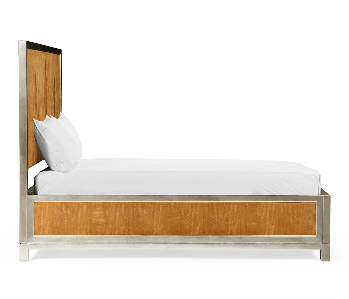Elegant satinwood parquetry bed designed by Alexander Julian inspired by "Herringbone blazersuit" and signature argyle diamonds the rectangular wooden panels enclosed by a silvered aluminium frame.