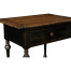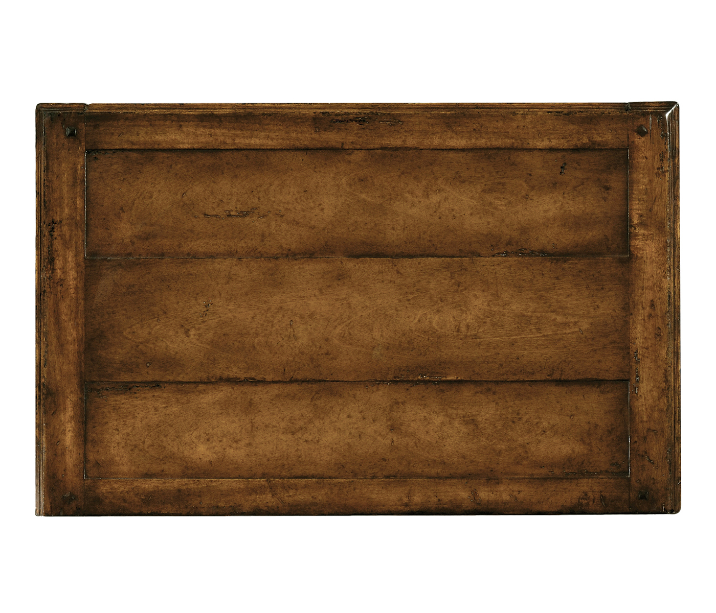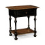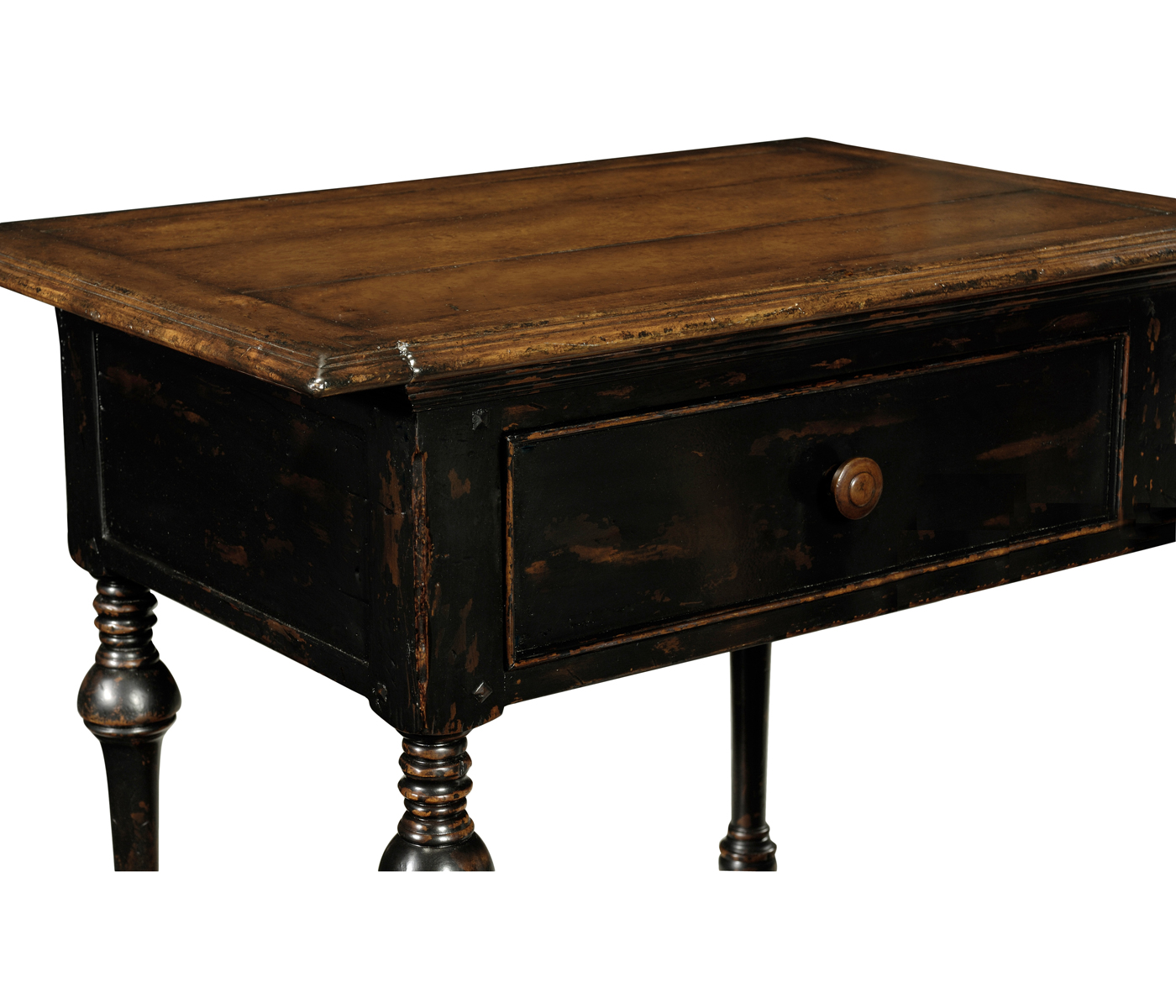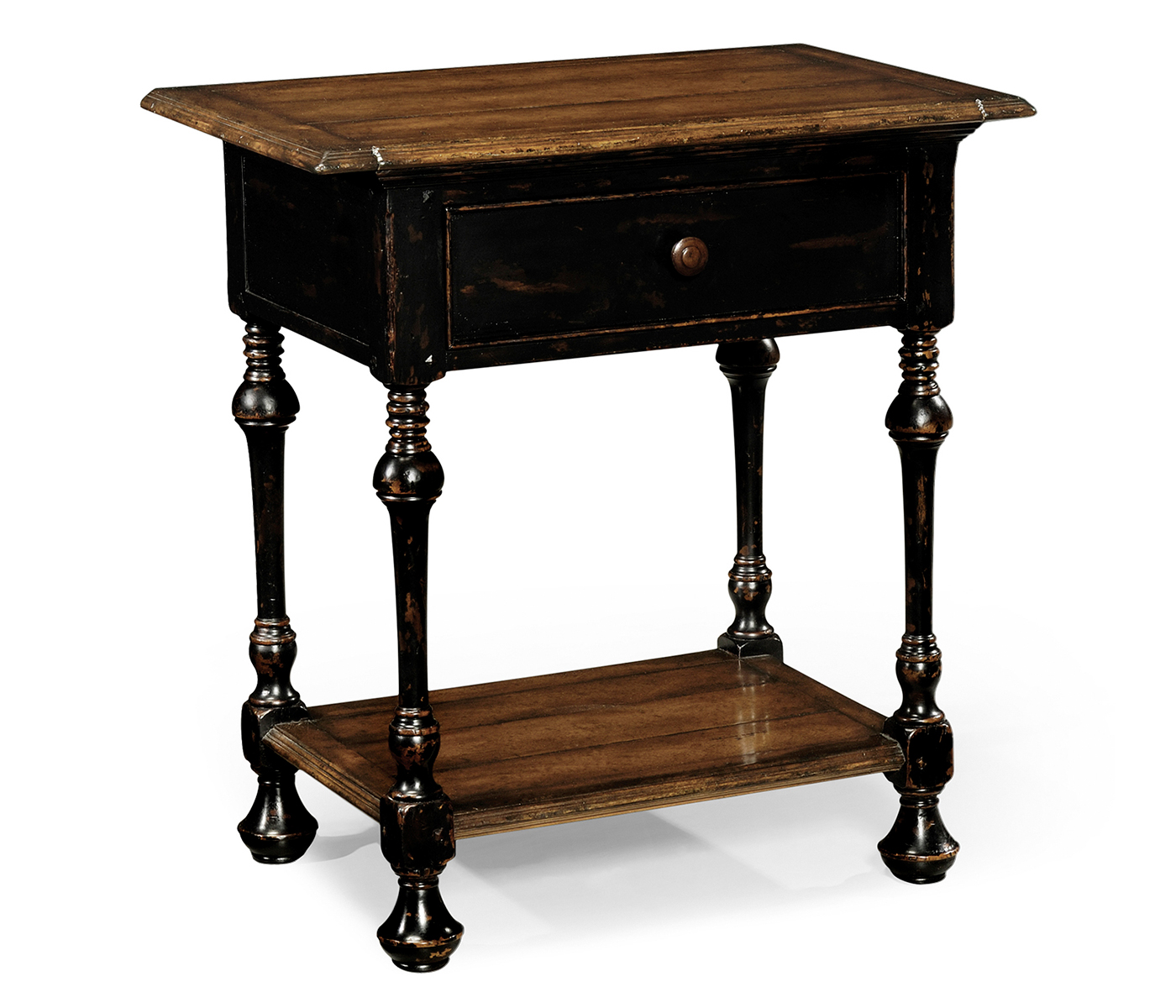 Planked walnut and black rub-through finish rectangular side table with tapering baluster legs and under-tier inspired by Northern Italian country furniture.