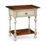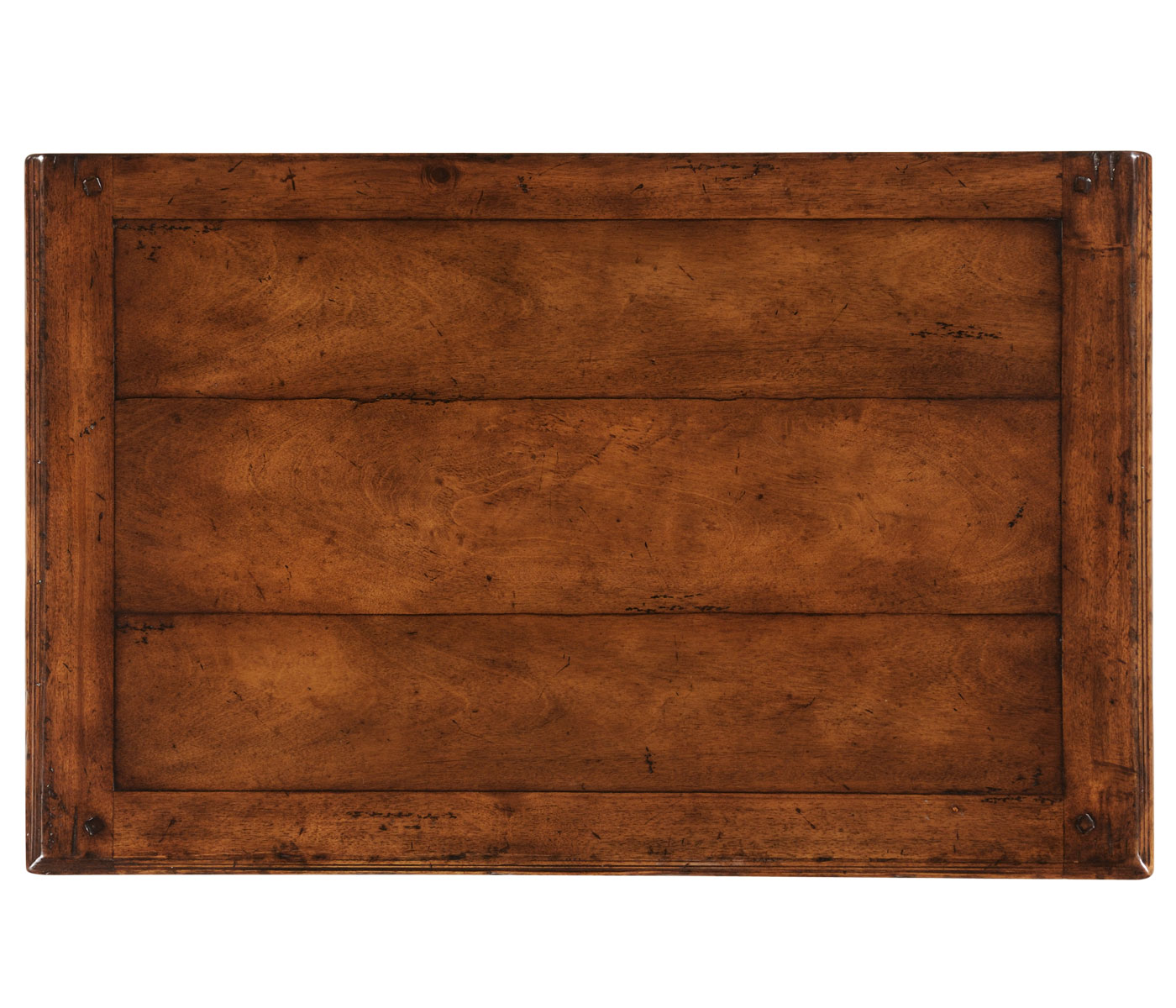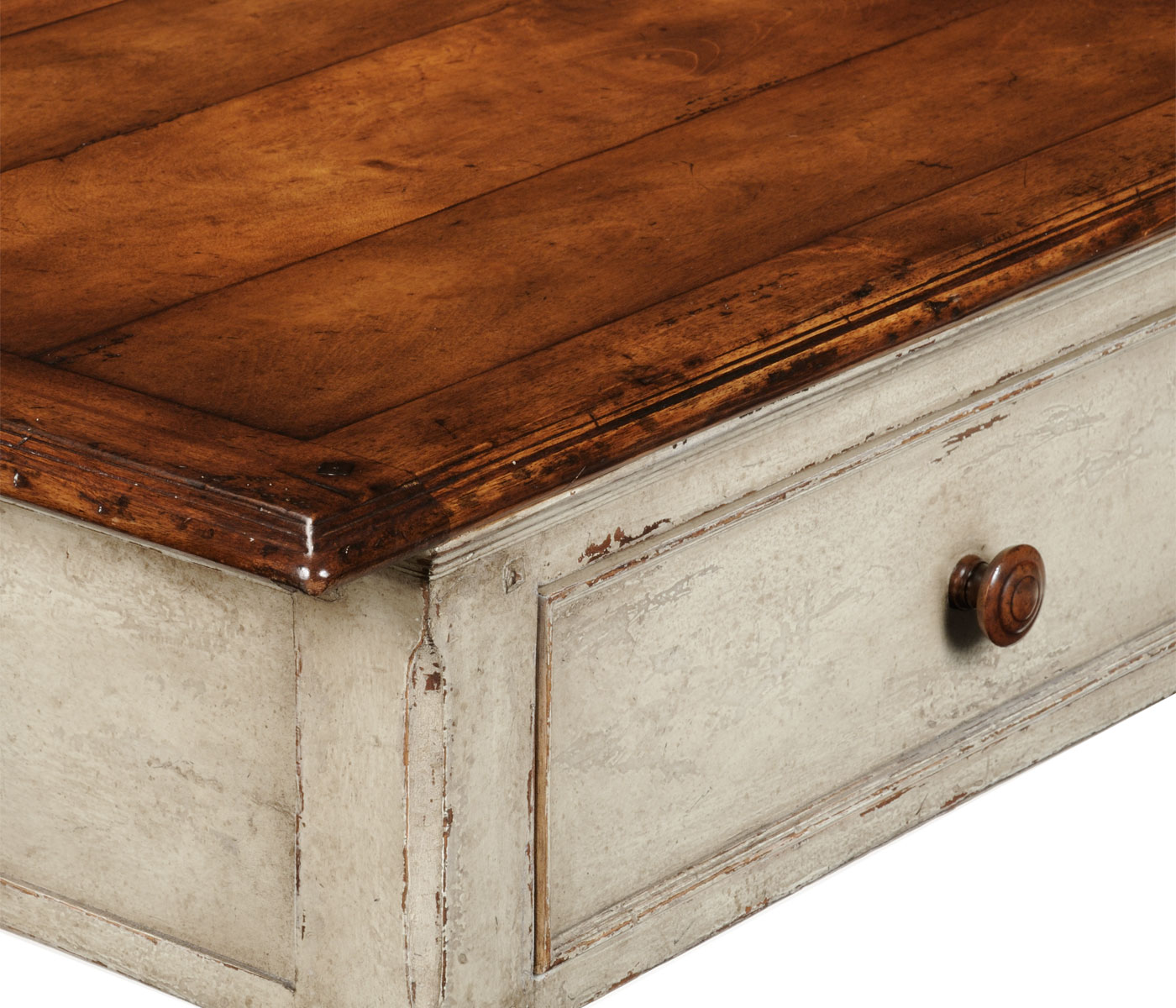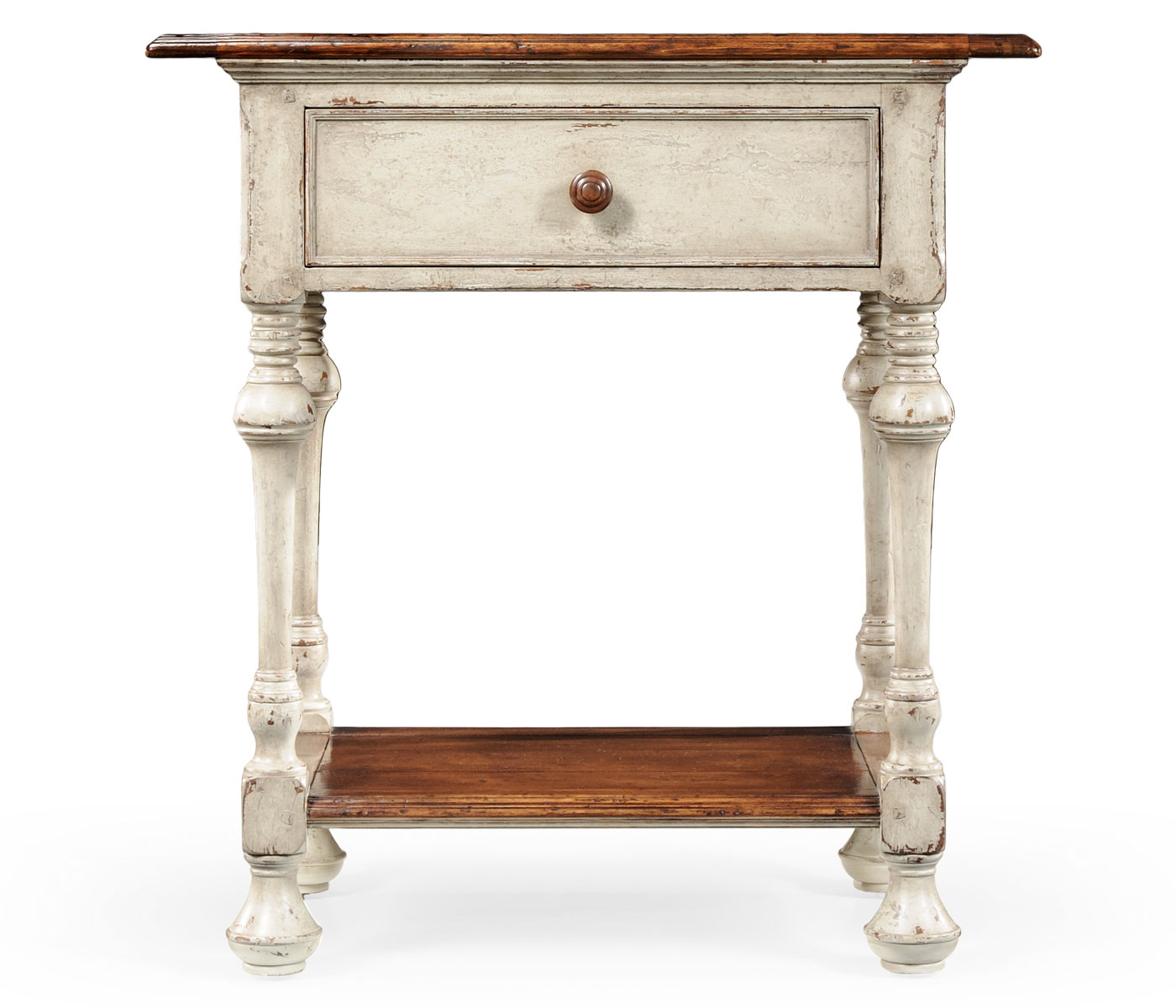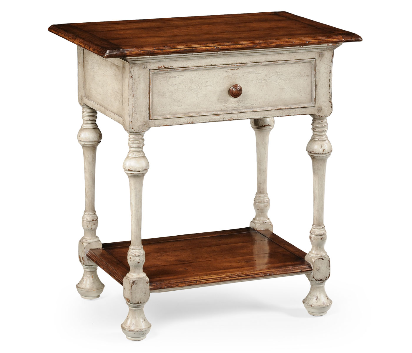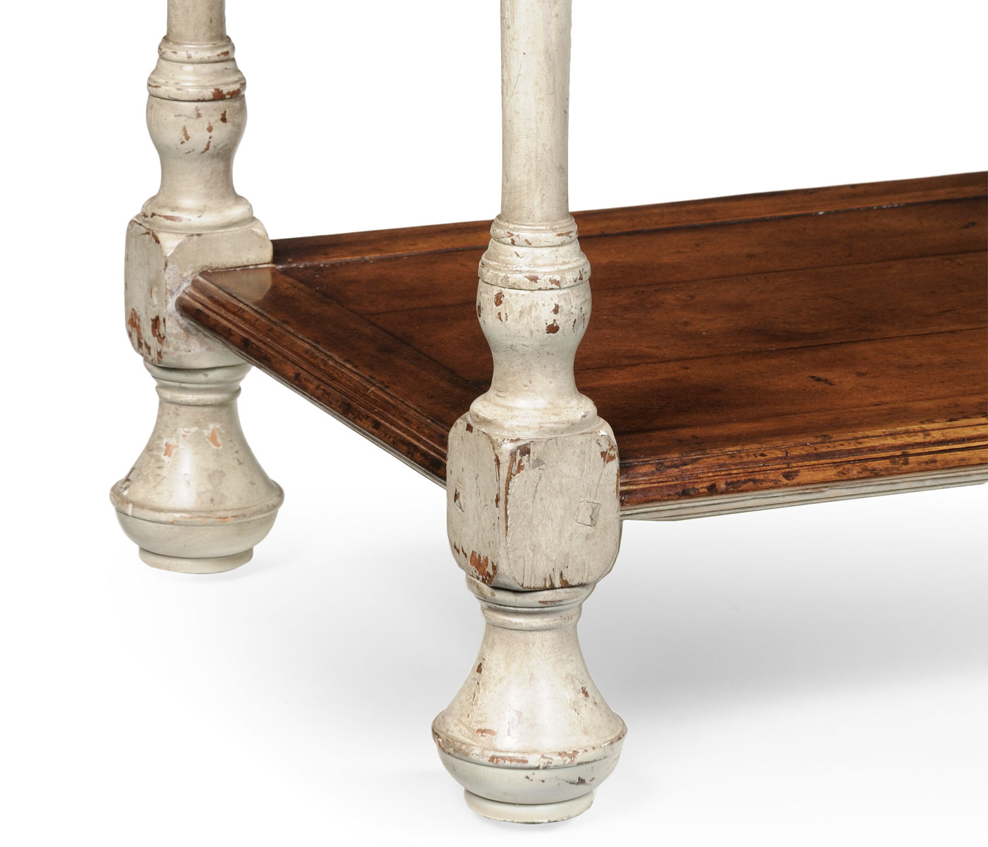 Planked walnut and white "rub-through" finish rectangular side table with tapering baluster legs and under-tier inspired by Northern Italian country furniture.