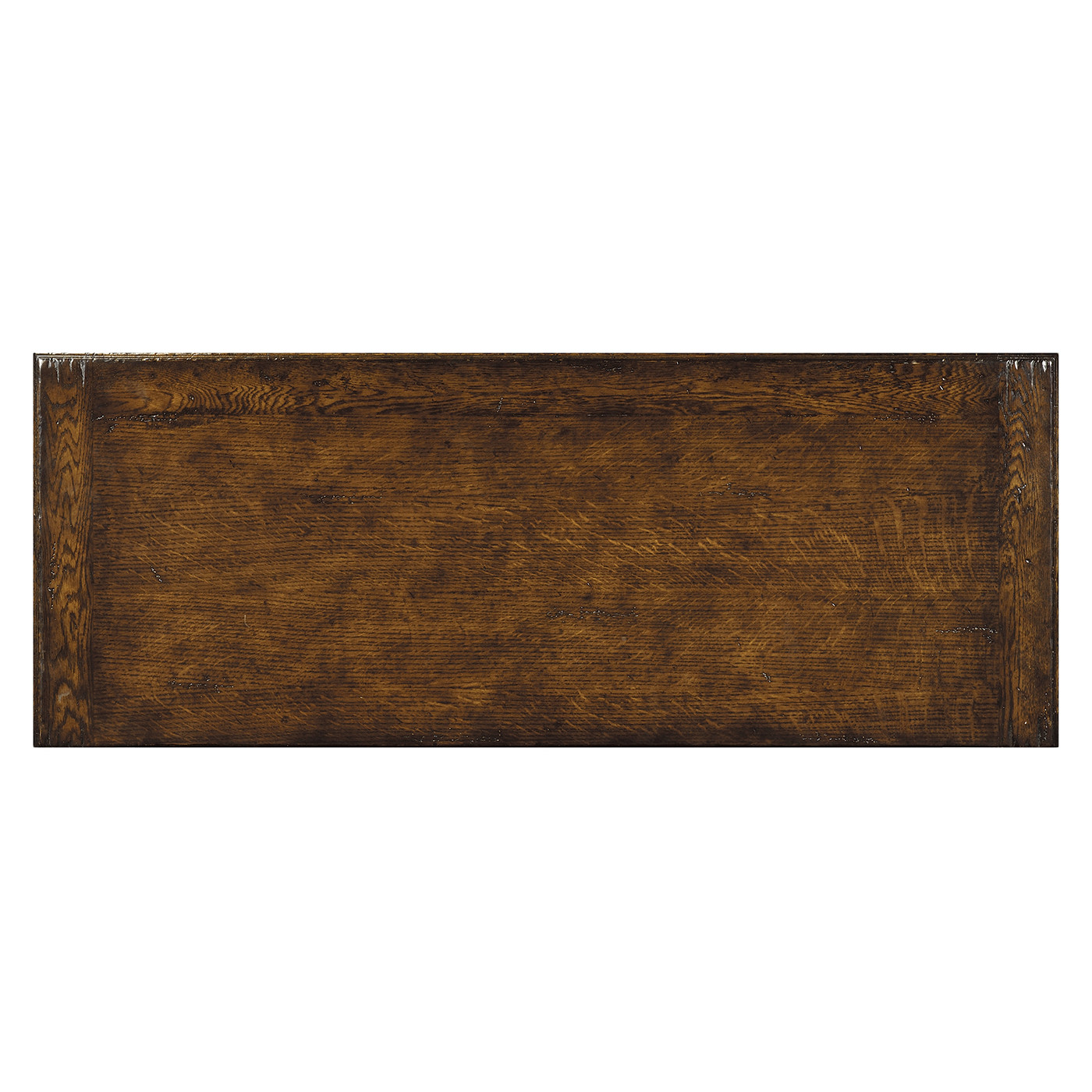 Dark oak substantial side cabinet with stepped pyramidial panelled mouldings to the two drawer fronts and doors, and stylised iron drawer handles and strap hinges. The design based on a transitional piece of c.1600. (Old salescode: 493560)