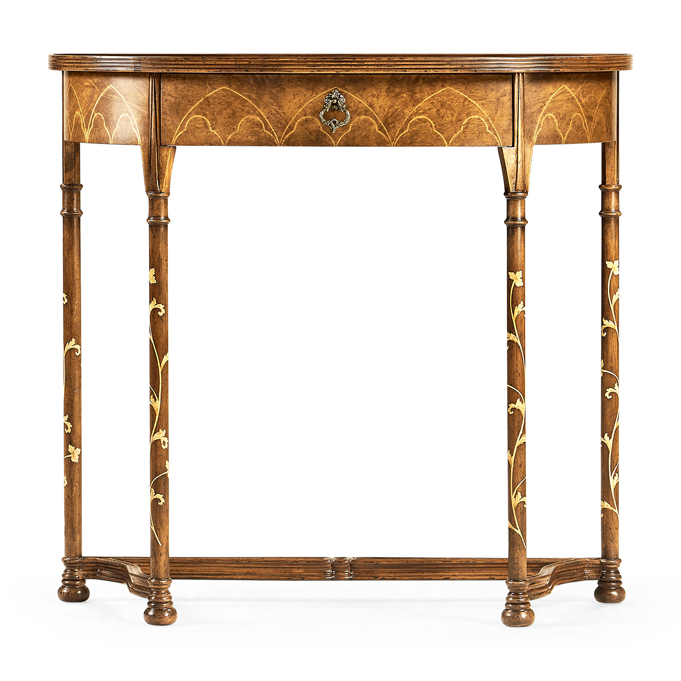 Burl walnut veneered demilune console table in the "Gothic" style of the late 18th century having fine contrasting inlays to the top and frieze, and legs with painted running floral motifs and arches. (Old salescode: 493231)