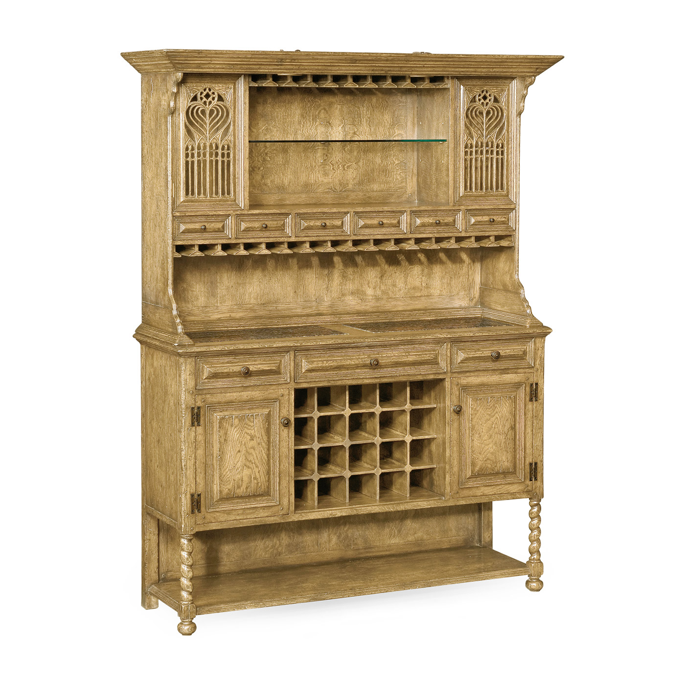 Natural oak substantial Welsh style dresser, designed for drinks storage, the upper section with pierced lancet details around a glass shelf, and with hanging glass storage, the lower with stepped pyramidial panelled mouldings to the drawer fronts and doors, around a wine rack. Range sensitive lighting with touch controlled dimmer.