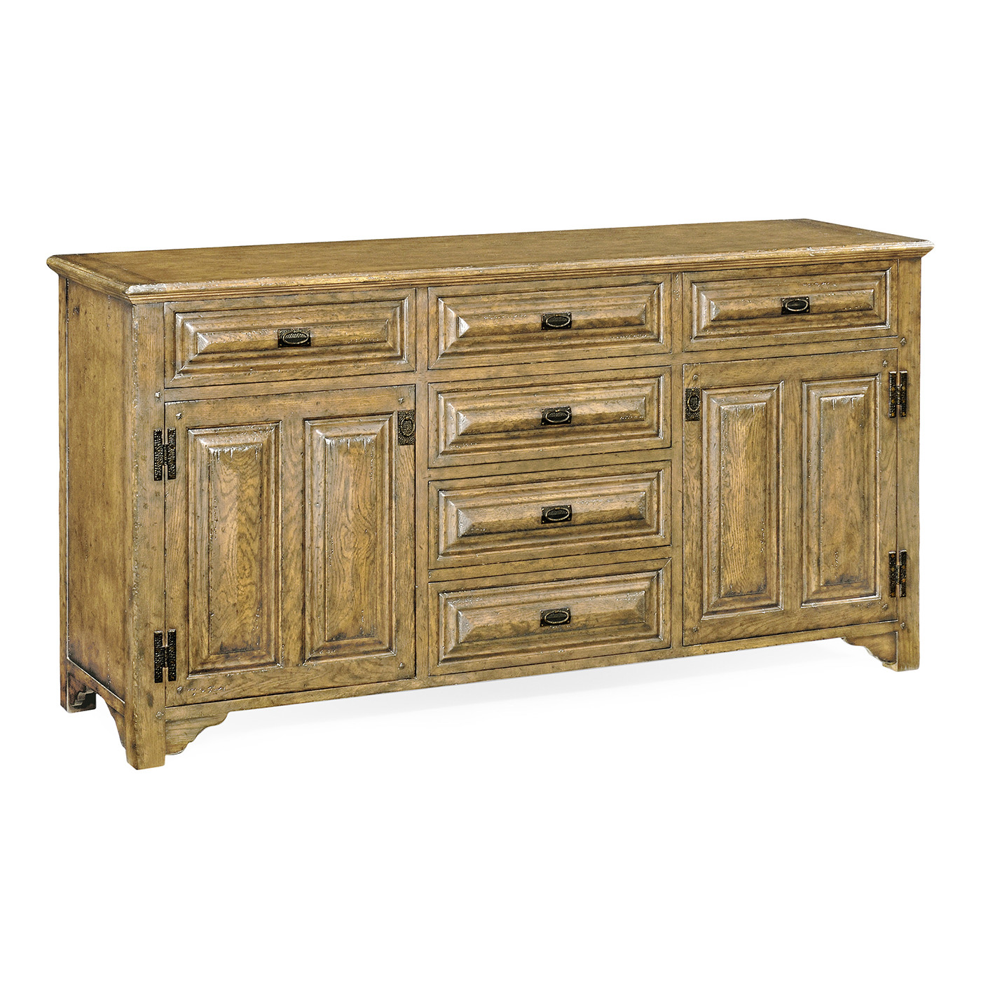 Natural oak substantial dresser base with stepped pyramidial panelled mouldings to the six drawer fronts and doors, and stylised iron drawer handles and strap hinges. The design based on a transitional piece of c.1600.