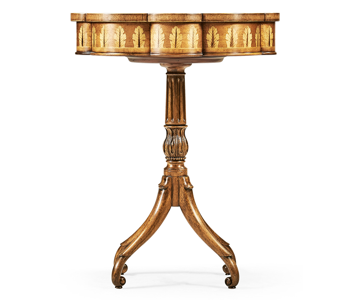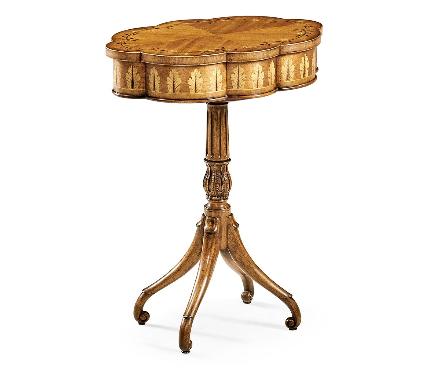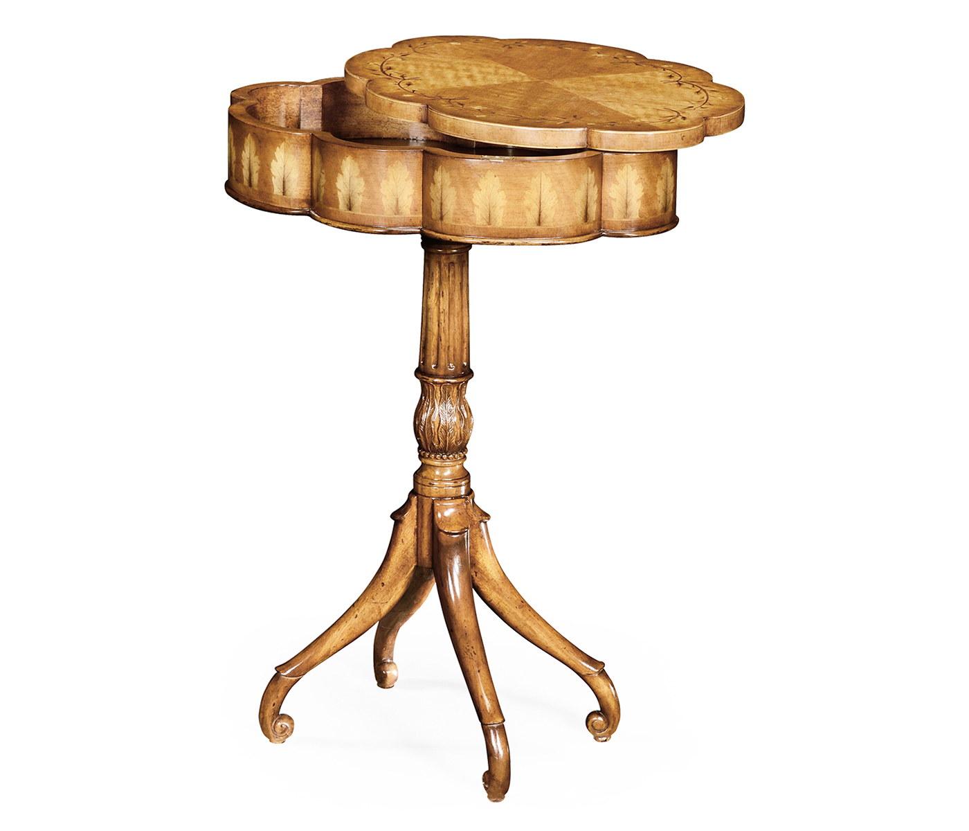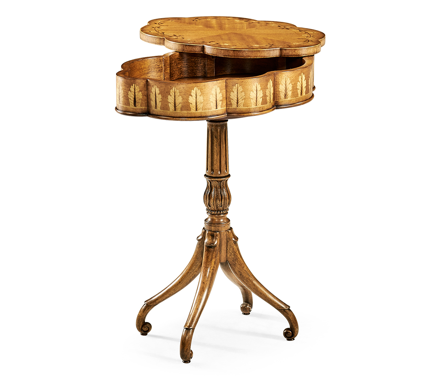 Sheraton inspired finely inlaid lamp table or work box with multiple lobed shaped lidded top set on a carved column and four splayed legs. The original of c.1780. (Old salescode: 495091)